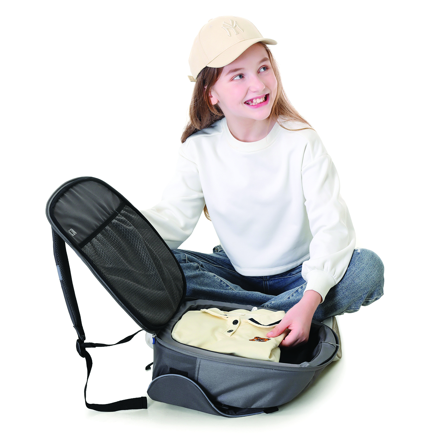 Fiind si un rucsac de calatorie aprobat pentru bagaj de mana, cu spatiu de depozitare de 8 litri, rucsacul compact (40 x 36 x 16 cm) este perfect pentru utilizare in calatoriile cu avionul, evitand astfel costurile mari pentru inchirierea unui scaun auto.